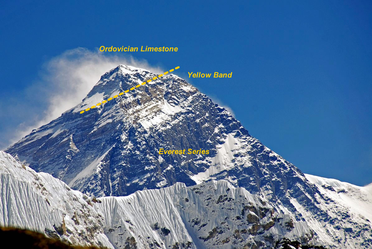 La mayor parte del Monte Everest, entre los 7000 y 8600 m.s.n.m., consiste en la Formación Collado Norte, que cuenta con la característica banda amarilla en su parte superior, entre 8200 a 8600 m.s.n.m. La “franja amarilla” está formada por capas intercaladas de mármol con diópsido-epidoto y capas de filita muscovitica, biotitica y semiesquistos. La edad de la franja amarilla se ha determinado en Cámbrico y en análisis petrográficos se han encontrado restos de crinoideos en el mármol.