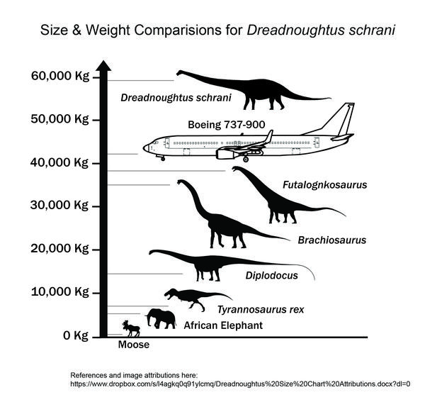 El patrón clave para calcular la masa de los cuadrúpedos –animales de cuatro patas– se basa en las medidas tomadas del fémur y del húmero. Como el espécimen Dreadnoughtus incluye ambos huesos, su peso se puede estimar con confianza. Antes de la descripción de este animal de 59 toneladas, otro gigante de la Patagonia, el dinosaurio Elaltitan tenía el título del dinosaurio con el mayor peso calculable –con 42,8 toneladas–. “Los titanosaurios son un grupo extraordinario de dinosaurios, con especies desde el peso de una vaca hasta el de un cachalote o más. Pero los titanosaurios más grandes suponían un misterio para los científicos porque, en la mayoría de los casos, sus fósiles están muy incompletos”, añade Matthew Lamanna, coautor y paleontólogo del Museo Carnegie de Historia Natural en los EE UU. Por ejemplo, el famoso Argentinosaurus podría haber tenido una masa corporal mayor que la de Dreadnoughtus, pero solo se han hallado media docena de vértebras provenientes de la mitad de su espalda, un hueso de la pata inferior y algunas otras pocas piezas fragmentadas; dado que el espécimen carece de huesos de las extremidades superiores, no existe ningún método fiable para calcular una masa.