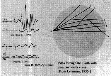 El descubrimiento sismológico del núcleo interno de la Tierra. De: I. Lehmann, P ', Oficina Central Seismologique Internacional, Serie A, Travaux Scientifiques, 14, 88, 1936