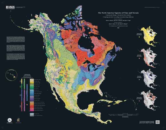 Este mapa-tapiz cartográfico se teje a partir de un mapa geológico y una imagen de relieve sombreado. Esta combinación digital revela la historia geológica de América del Norte a través de la interrelación de los tipos de roca, la topografía y el tiempo. Los procesos geológicos regionales, así como los eventos tectónicos a escala continental están expuestos en las tres dimensiones del espacio y de la cuarta dimensión, el tiempo geológico. Este gran mapa muestra la edad variable de roca subyacente de América del Norte, mientras que cuatro mapas más pequeños muestran la distribución de los cuatro tipos principales de rocas: sedimentarias, volcánicas, plutónicas y metamórficas.