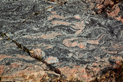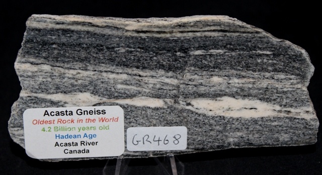 Muestra del Gneiss de Acasta. Se oberva el bandeamiento y la mineralización.