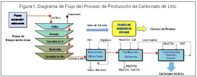 El proceso para recuperar litio a partir de las salmueras consiste básicamente en bombear salmueras desde pozos de extracción a un sistema de pozas de evaporación solar, donde las salmueras se concentran en proceso continuo y en etapas sucesivas durante un período de 14 a 15 meses, desde aprox. 0,2% de litio hasta cerca de 6% de litio. Durante la concentración se eliminan impurezas (sales de sodio, potasio y magnesio) que cristalizan en las pozas en forma secuencial, utilizándose la silvinita para producir cloruro de potasio.