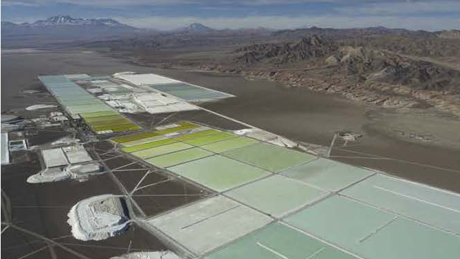 Depósitos donde se evaporan las salmueras y se extraen las sales de litio. Chile (SQM)