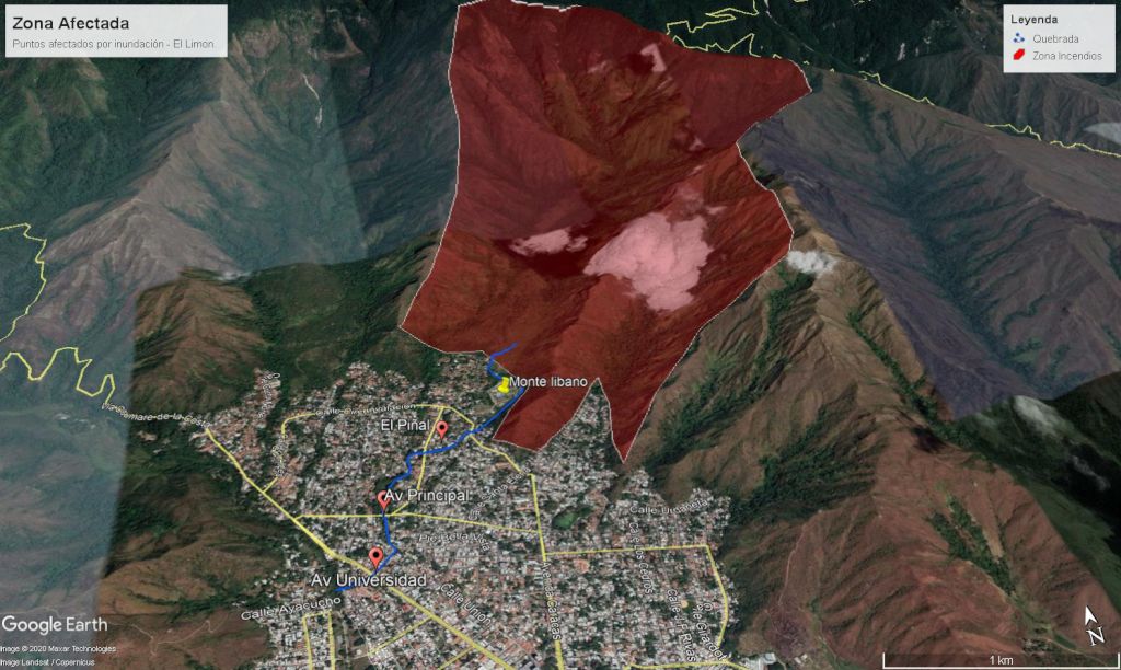 En una zona deshabitada, las áreas de las riberas de quebradas se verían afectadas por el desborde sin mayores daños. En El Limón, la zona de protección de la ribera del río no ha sido respetada y existen casas en las márgenes de las quebradas. A esto se le suman cauces llenos de basura y sectores como puentes y curvas donde se producen cuellos de botella que acumulan escombros. Se aprecia en las fotos y videos la gran cantidad de escombros (troncos secos y rocas) que evidencian que buena parte de los restos del bosque quemado bajaron por la quebrada. También se observó gran cantidad de pipotes de plástico y basura arrastrada.
