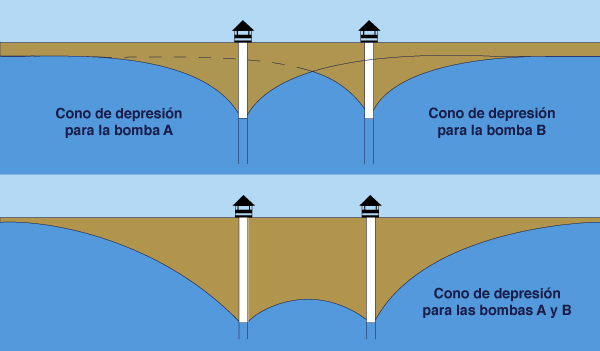 Si dos pozos están muy cerca, los conos de depresión se solapan y se afecta el aforo de ambos. Puede suceder que uno de los pozos se seque puesto que el nivel de explotación del pozo seco quedo por encima del cono de depresión del otro pozo y evita que la bomba reciba suficiente agua.