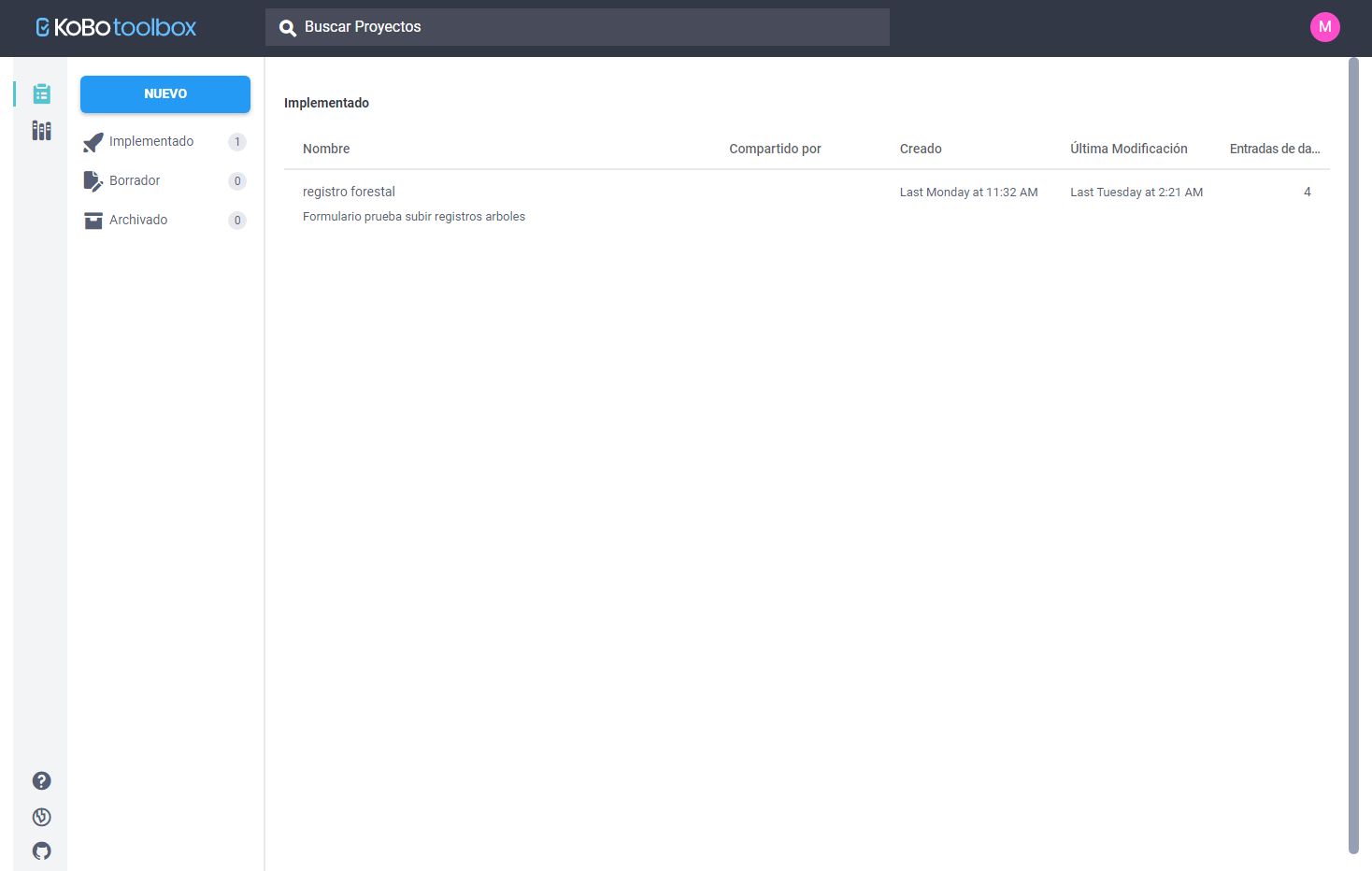El escritorio o Dashboard de kobotoolbox va a lucir de esta manera