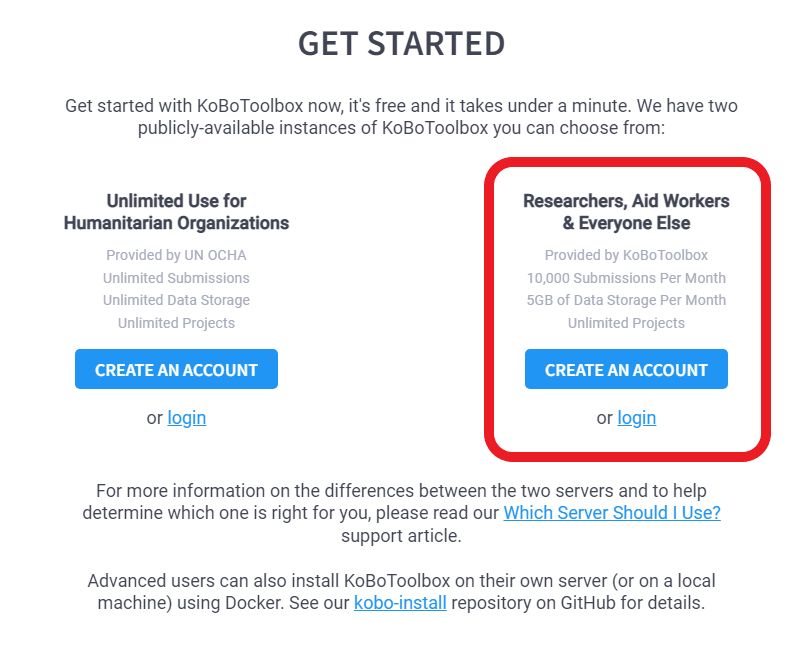 En la web de KoboToolBox debemos encontrar la sección para crear la cuenta (GET STARTED) y usar la opcion para Investigadores, Prestadores de Ayuda y Todos los demas.