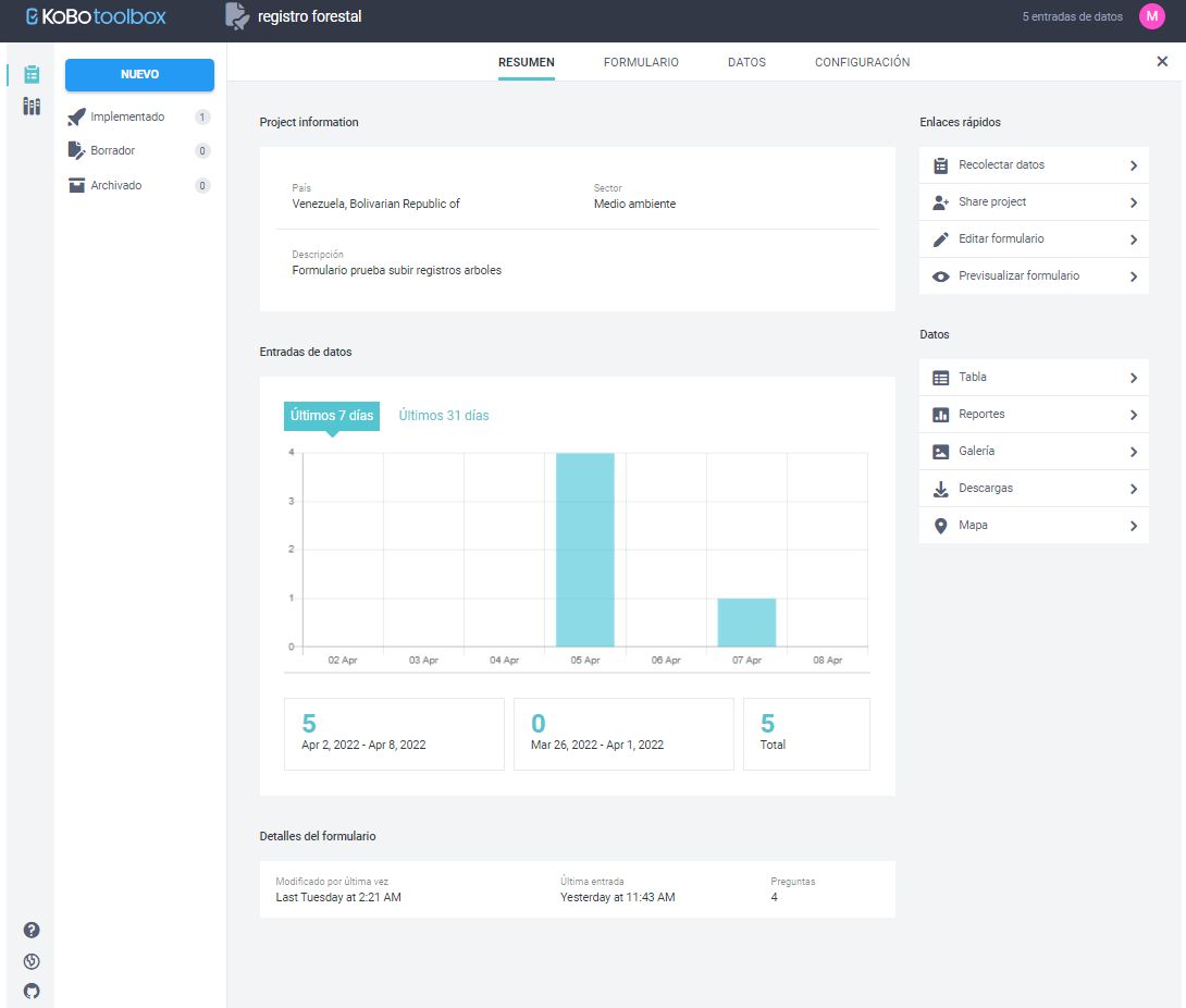 Para visualizar los datos cargados, visite su Dashboard en KoboToolbox. (https://kf.kobotoolbox.org/) . Tendrá algo parecido a esto: