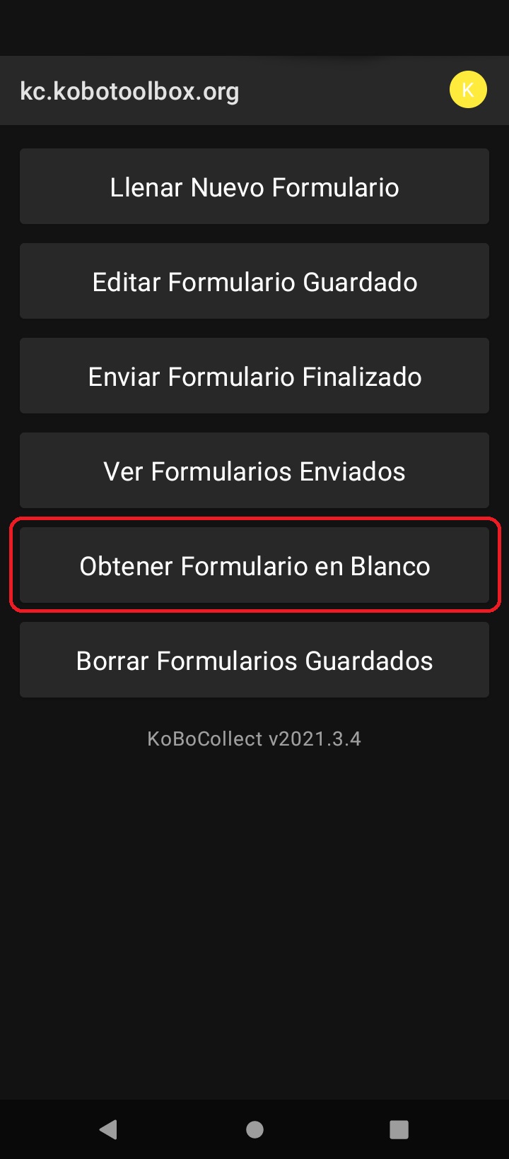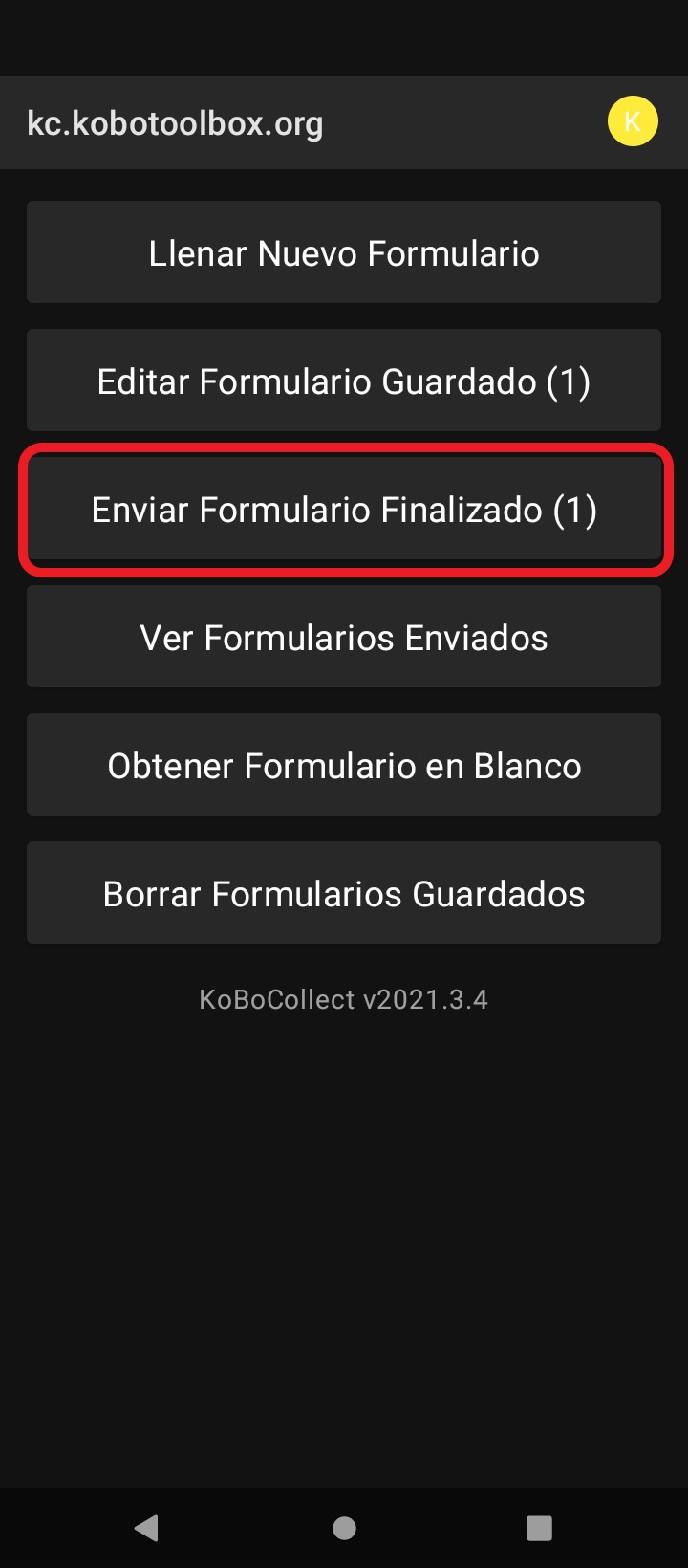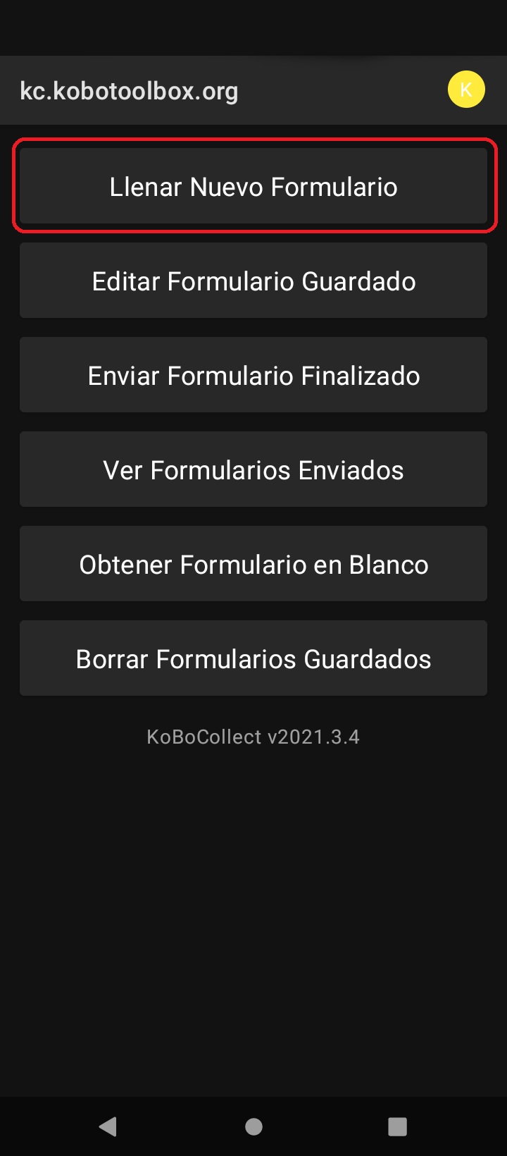 NOTA: En la lista de formularios disponibles aparecerán solo aquellos formularios que usted haya marcado como IMPLEMENTAR en KoboToolbox. Si está trabajando con un formulario hecho por otra persona, aparecerán aquellos cuyo creador haya compartido con usted. Si falta algún formulario, revise su cuenta de KoboToolbox o contacte al creador del formulario.