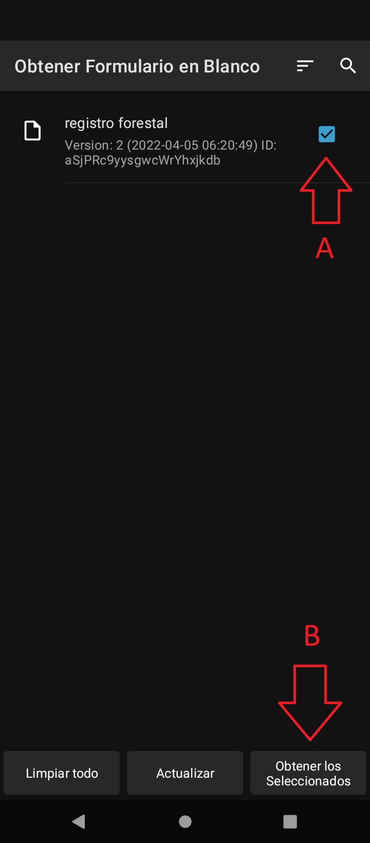 La opción OBTENER FORMULARIO EN BLANCO va a conectarse al servidor y descargar la lista de formularios disponibles. Pulse la opción y aparecerán los formularios disponibles.
