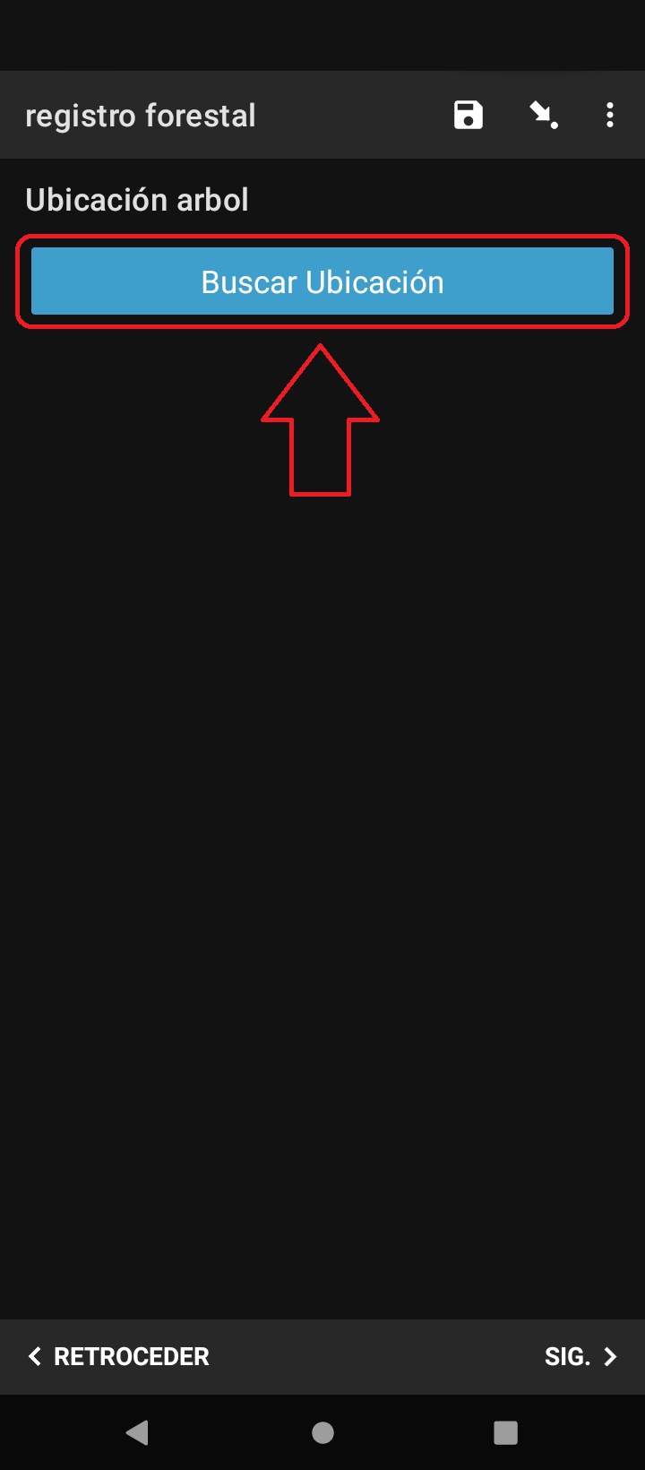 - (1) Seleccionar ubicación del árbol. Requiere GPS y buena cobertura de satélite. Asegúrese de estar al aire libre, NO debajo de un techo o alguna estructura que interfiera con la geolocalización.