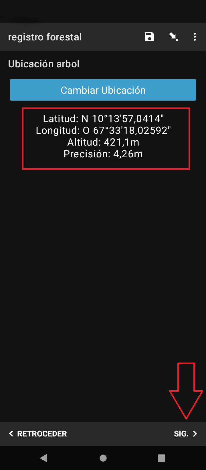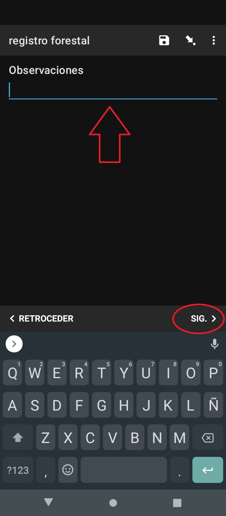El paso final en el formulario Registro Forestal Versión 1.0, es un campo de texto que permite recolectar observaciones sobre el árbol. Puede dejar en blanco pulsan en SIGUIENTE (abajo a la derecha). Este campo sólo acepta letras y números.