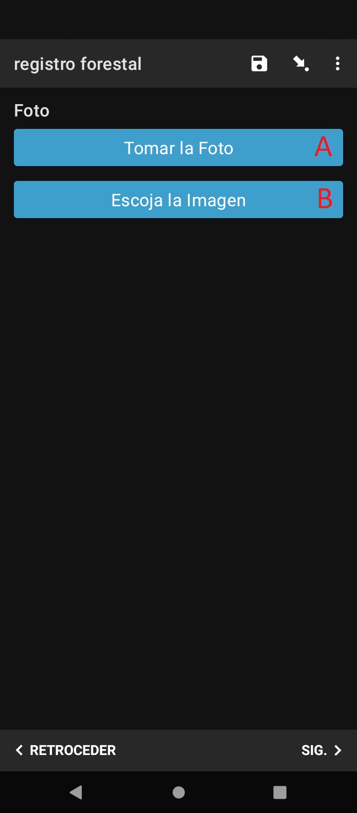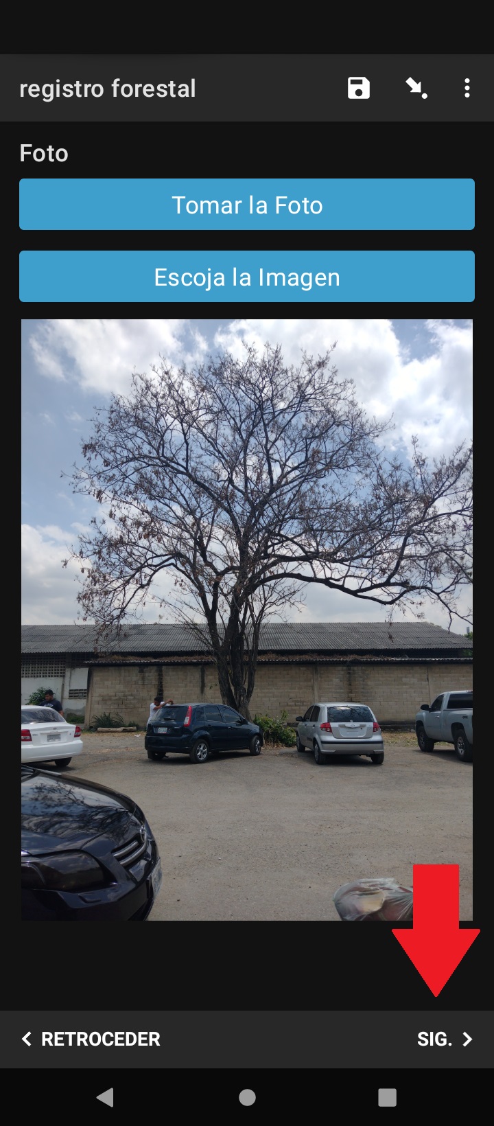 - (2) Tomar foto del árbol. Se recomienda tomar la foto en el momento de la visita al árbol, buscando que aparezca copa y tronco. Es posible seleccionar una foto ya tomada previamente, pero considere que debe llenar el formulario en la ubicación real del árbol para evitar distorsión en los datos.
