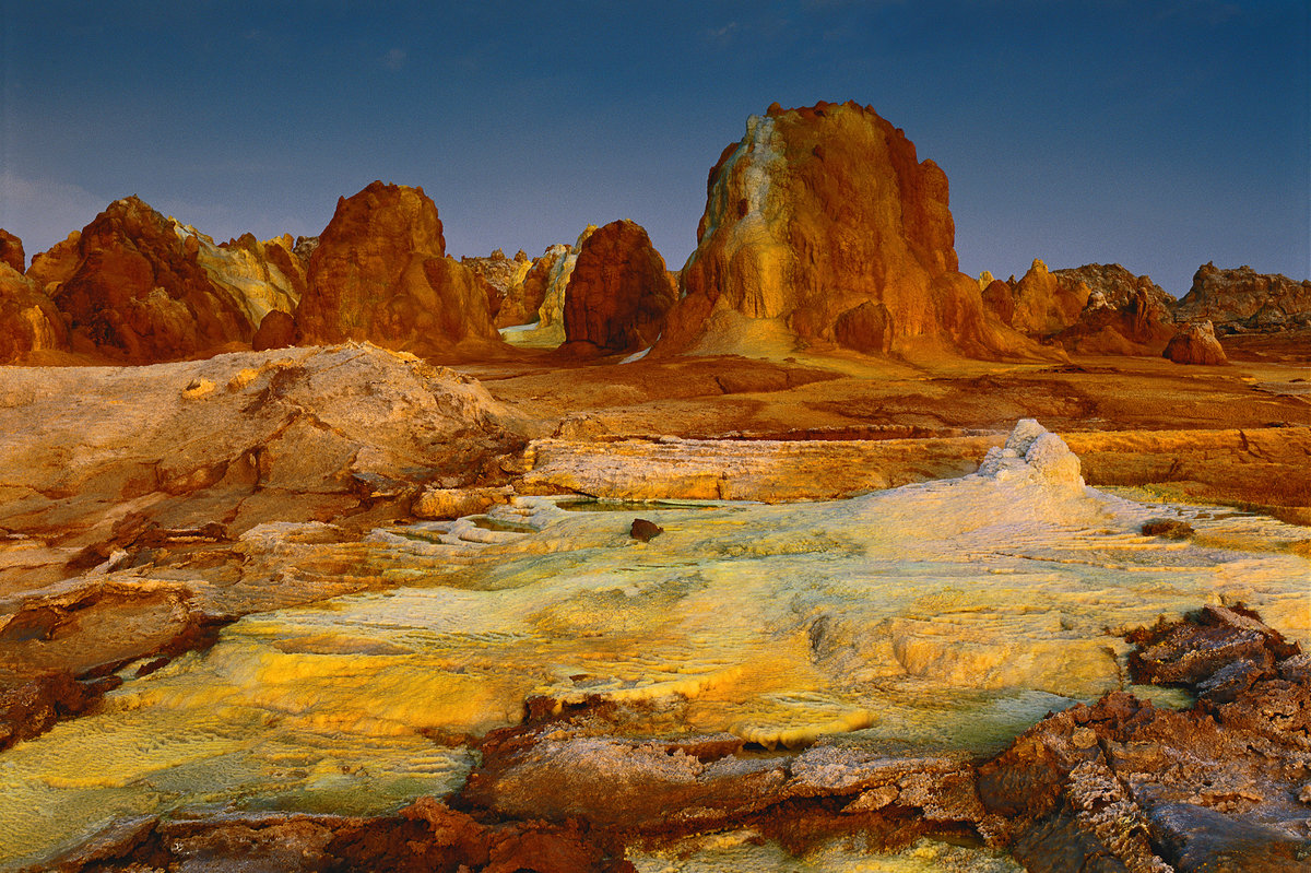 El sitio hidrotermal de Dallol, en Etiopía, está salpicado de montículos de geyserita formados por las aguas fuertemente mineralizadas que se elevan a través de una cúpula de sal. ©Olivier Grunewald